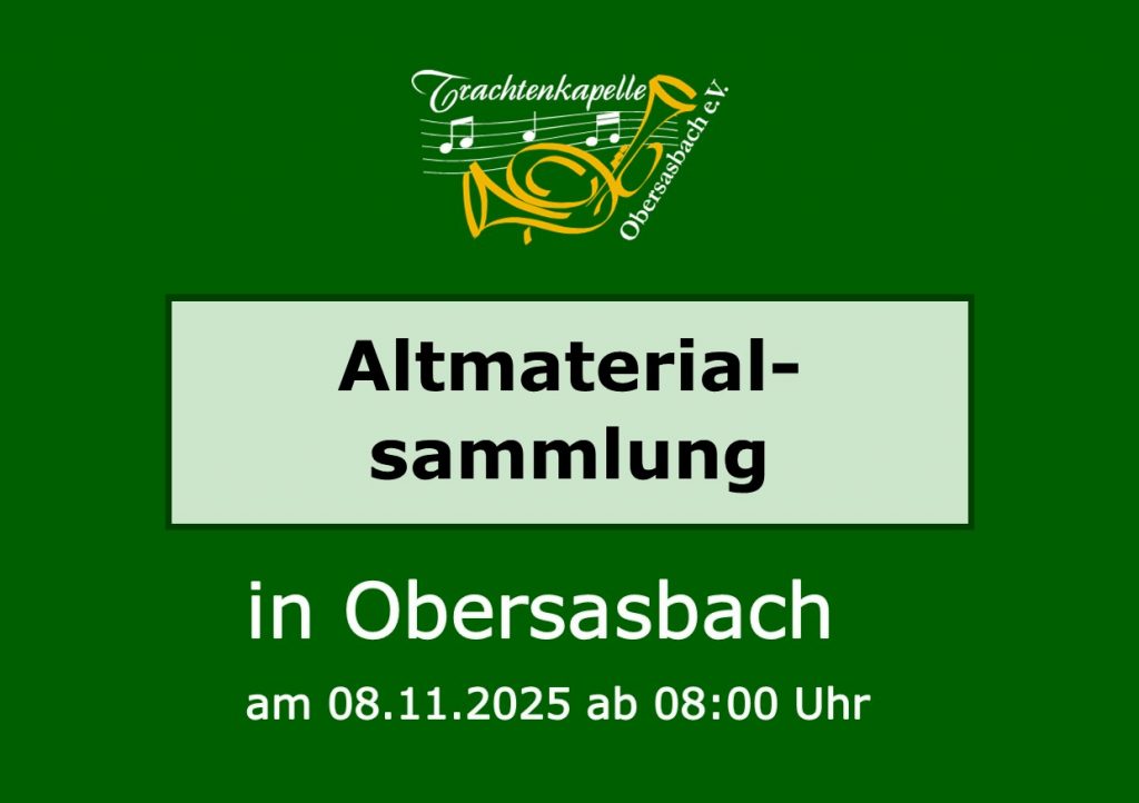 - Altmaterialsammlung in Obersasbach am Samstag, den 08.11.2025Am Samstag, den 08.11.2025 findet ab 08:00 Uhr wieder unsere Altmaterialsammlung in Obersasbach statt. Gesammelt werden neben Altpapier sämtliche Altmaterialien wie z.B.: Dachrinnen, Gartenzäune aus Metall, Metallrohre von Heizungs- u. Wasserinstallationen, Heizkörper, Badewannen aus Guss oder Stahlblech, landwirtschaftliche Maschinen und Geräte, Elektroherde,… Altmaterialsammlung in Obersasbach am Samstag, den 08.11.2025 weiterlesen