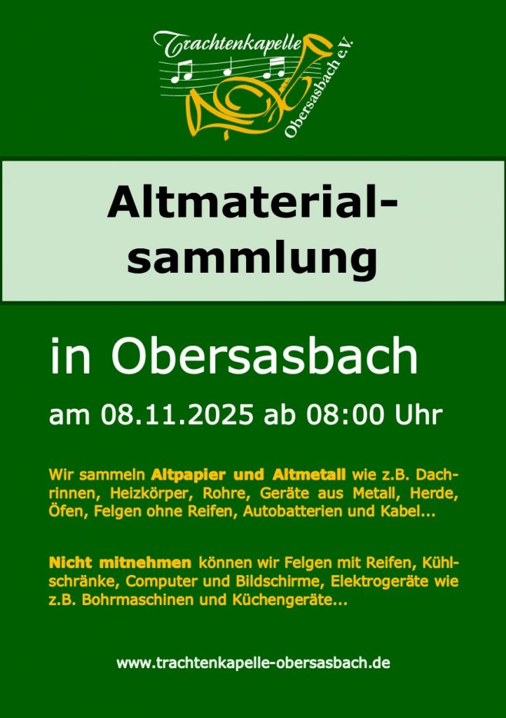 Wir möchten Sie schon heute herzlich bitten Ihr Altmaterial für uns aufzuheben und am Samstag, den 08.11.2025 an der Straße bereitzustellen.